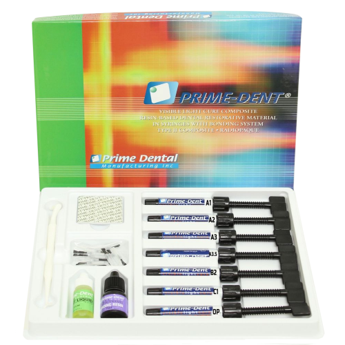 Набор композитов Prime-dent на основе светоотверждаемого полимера BIS-GMA применяется для создания долговечных эстетичных реставраций. Высокая прочность достигается за счет использования неорганического наполнителя фракции 1,4 мкм.